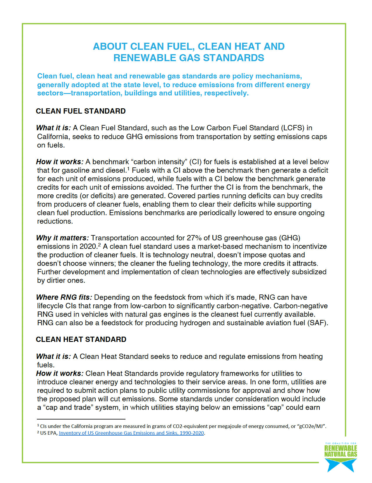 Clean fuel, clean heat and renewable gas standards are policy mechanisms, generally adopted at the state level, to reduce emissions from different energy sectors—transportation, buildings and utilities, respectively.